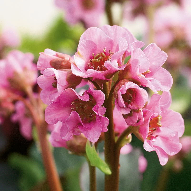 Bio Bergenien sind robuste, wintergrüne Frühblüher, die von April bis Mai mit rosafarbenen Blüten begeistern. Die dunkelgrünen Blätter der Bergenie ‚Rosenkristall‘ (Bergenia ‚Rosenkristall‘) färben sich im Herbst rot und setzen so farbstarke Akzente im herbstlichen Garten. Das Laub eignet sich zudem hervorragend zum Schnitt.