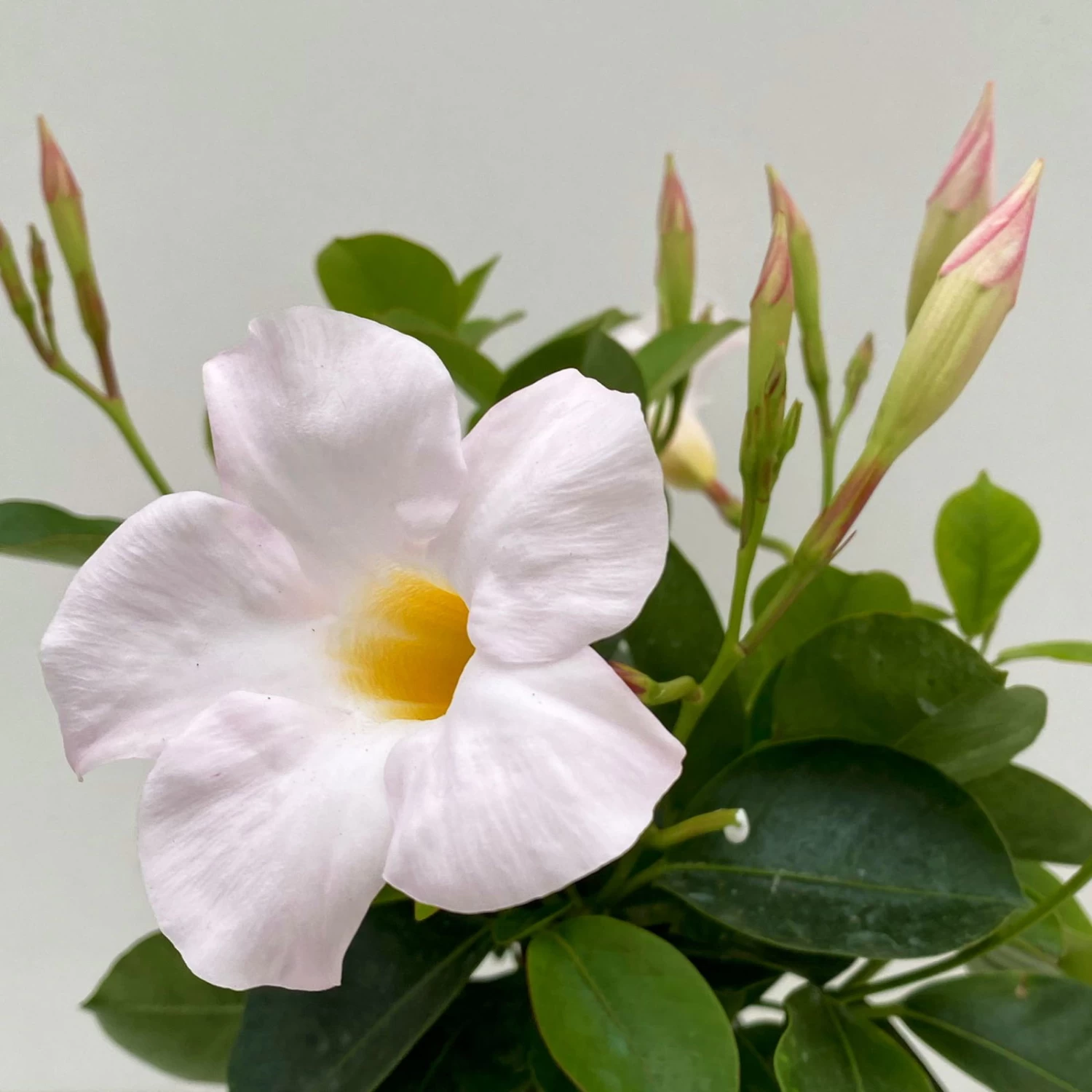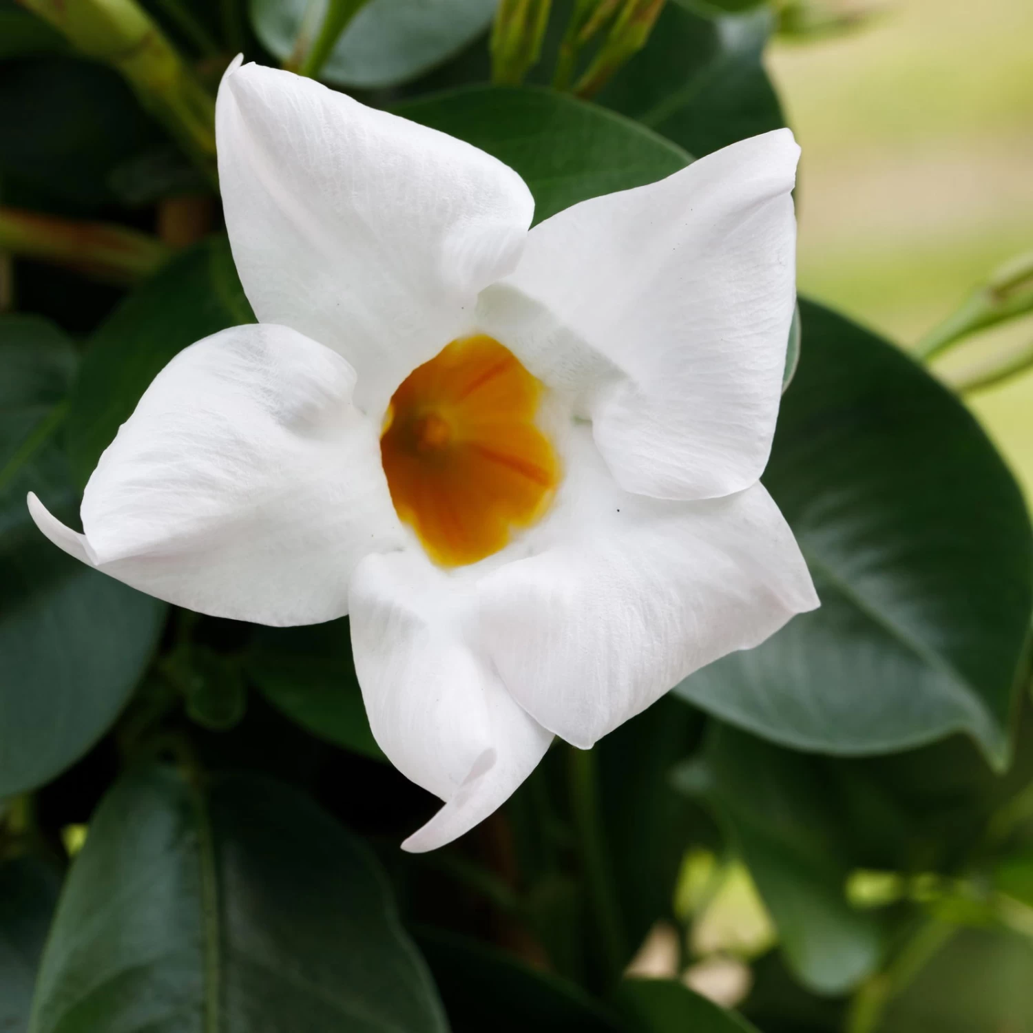 Die großen Blüten sind trichterförmig ausgebildet und begeistern in der Farbe Weiß. Von Mai bis Oktober setzt die Dipladenie schöne Akzente in Ihrem Zuhause.