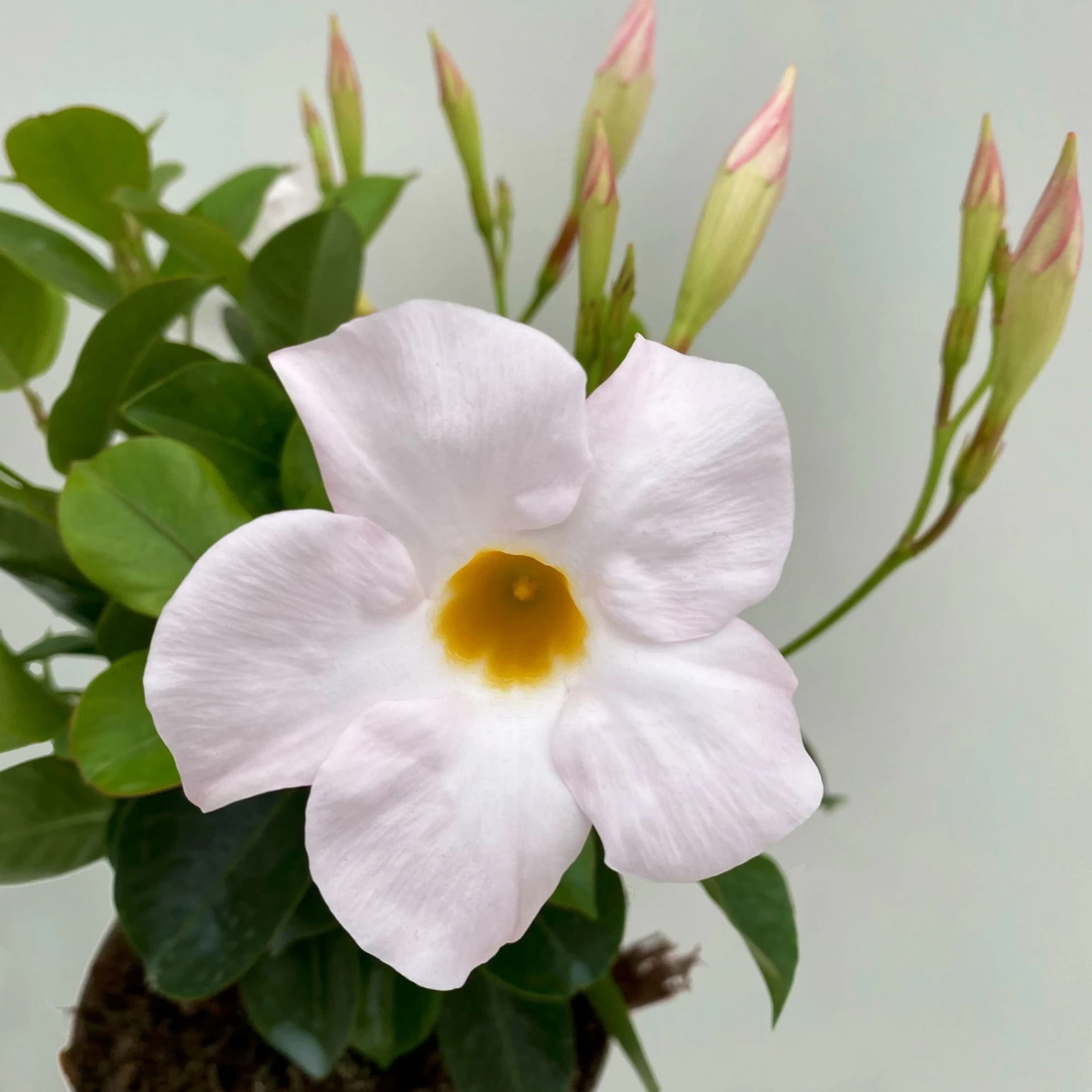 Um das Wachstum und die Blüte zu fördern, sollte die Dipladenie nach dem Kauf in ein größeres Gefäß mit strukturstabiler Kübelpflanzenerde umgetopft werden. So werden Sie noch mehr Freude, an Ihrer Dipladenie haben.