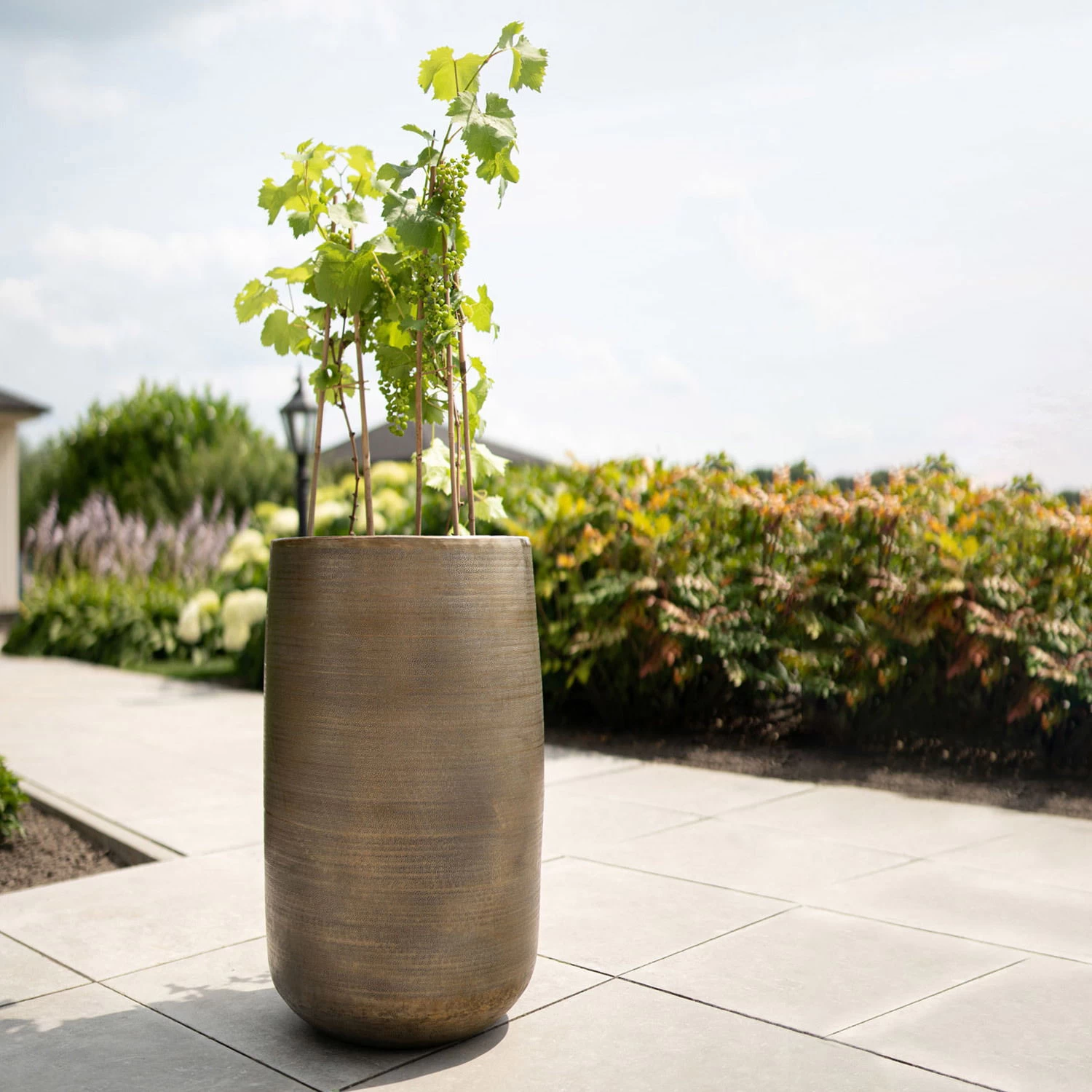 Das Pflanzgefäß ‚Rowen‘ besticht durch seine effektvolle schlanke Form und setzt dank der golden schimmernden Oberfläche glamouröse Akzente. Dieses Schmuckstück besteht aus hochwertig verarbeitetem Aluminium und fasziniert durch eine per Hand aufgetragene Oberflächenstruktur. Somit bekommen Sie mit jedem Pflanzgefäß ‚Rowen‘ ein Unikat in Designerqualität. Dabei sieht der Pflanztopf aus Alu nicht nur schick aus, sondern ist witterungsbeständig und rostfrei. Es ist problemlos möglich, dieses Gefäß ganzjährig draußen stehen zu lassen. Mit einem Fassungsvermögen von rund 43 Litern bietet das Pflanzgefäß ‚Rowen‘ genug Platz für die Wurzeln und harmoniert dank seiner schmalen Form sowohl mit überhängend als auch mit aufrecht wachsenden Zierpflanzen.
