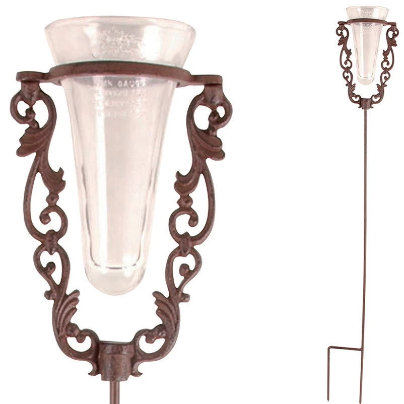 Der Regenmesser aus Gußeisen vereint filigrane Handwerkskunst mit Praktikabiltät. Dieser Niederschlagsmesser besteht aus einer Halterung aus rostbraunem Gußeisen sowie einem Messeinsatz aus Glas. Ab sofort wissen Sie dank dieses Regenmessers für Ihren Garten immer genau, wie viel es geregnet hat.