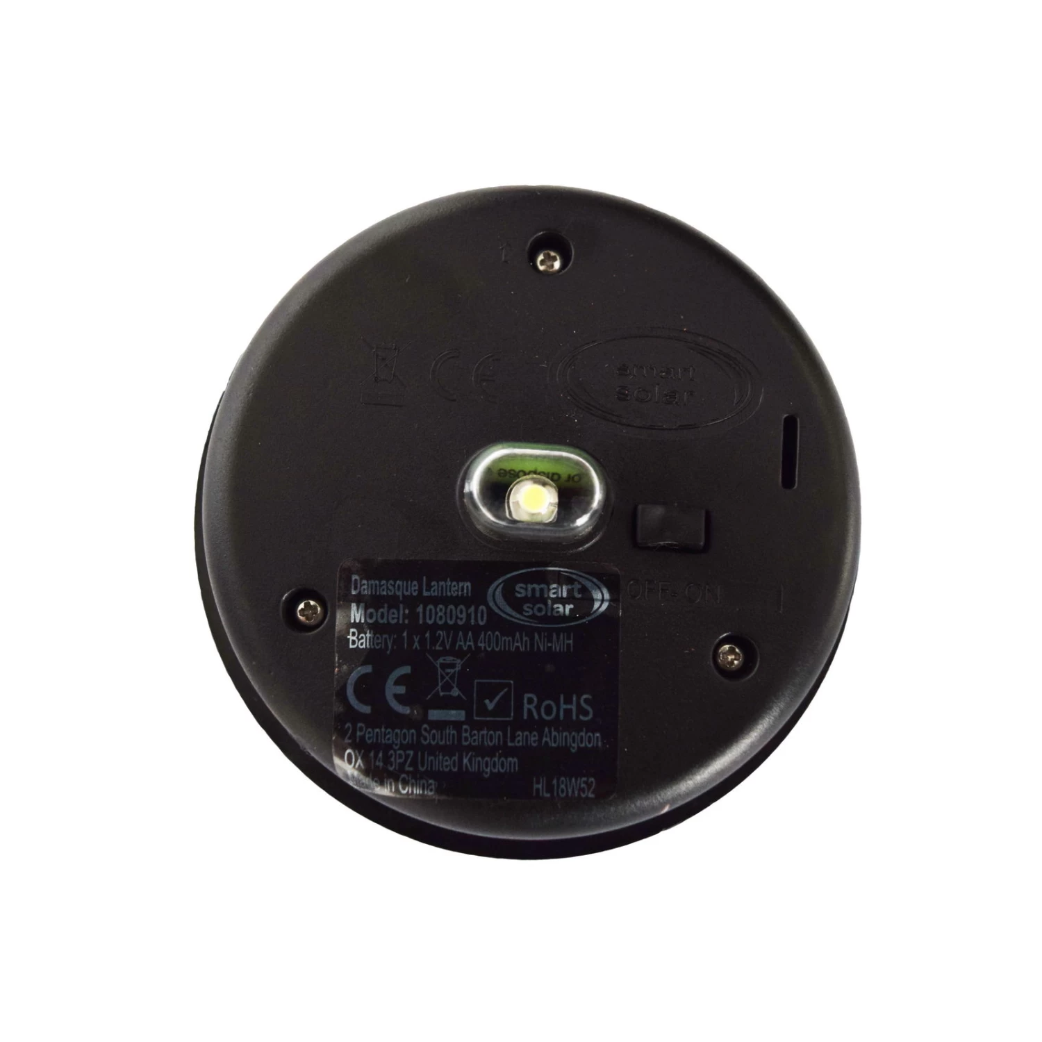 Die Solar Laterne Damast lädt sich tagsüber im direkten Sonnenlicht mittels der Solarbatterie auf. Sobald die Dunkelheit einbricht, scheint die stimmungsvolle Beleuchtung mindestens 6 Stunden lang für Außen. Auch ohne ausreichend Sonnenschein – beispielsweise an dunklen Wintertagen – müssen Sie nicht auf das einzigartige Licht der Solarlaterne verzichten, denn Sie können die Akkus der Leuchte ausbauen und separat mit einem Batterieladegerät (mit mindestens 400 mAh) laden. Außerdem sind die Batterien austauschbar. Die Solarlaterne kann als Leuchte und gleichermaßen auch als Deko z. B. für Camping eingesetzt werden. Durch die Möglichkeit von Solar- und Batteriebetrieb verhilft sie zuverlässig zu einem schönen Licht.