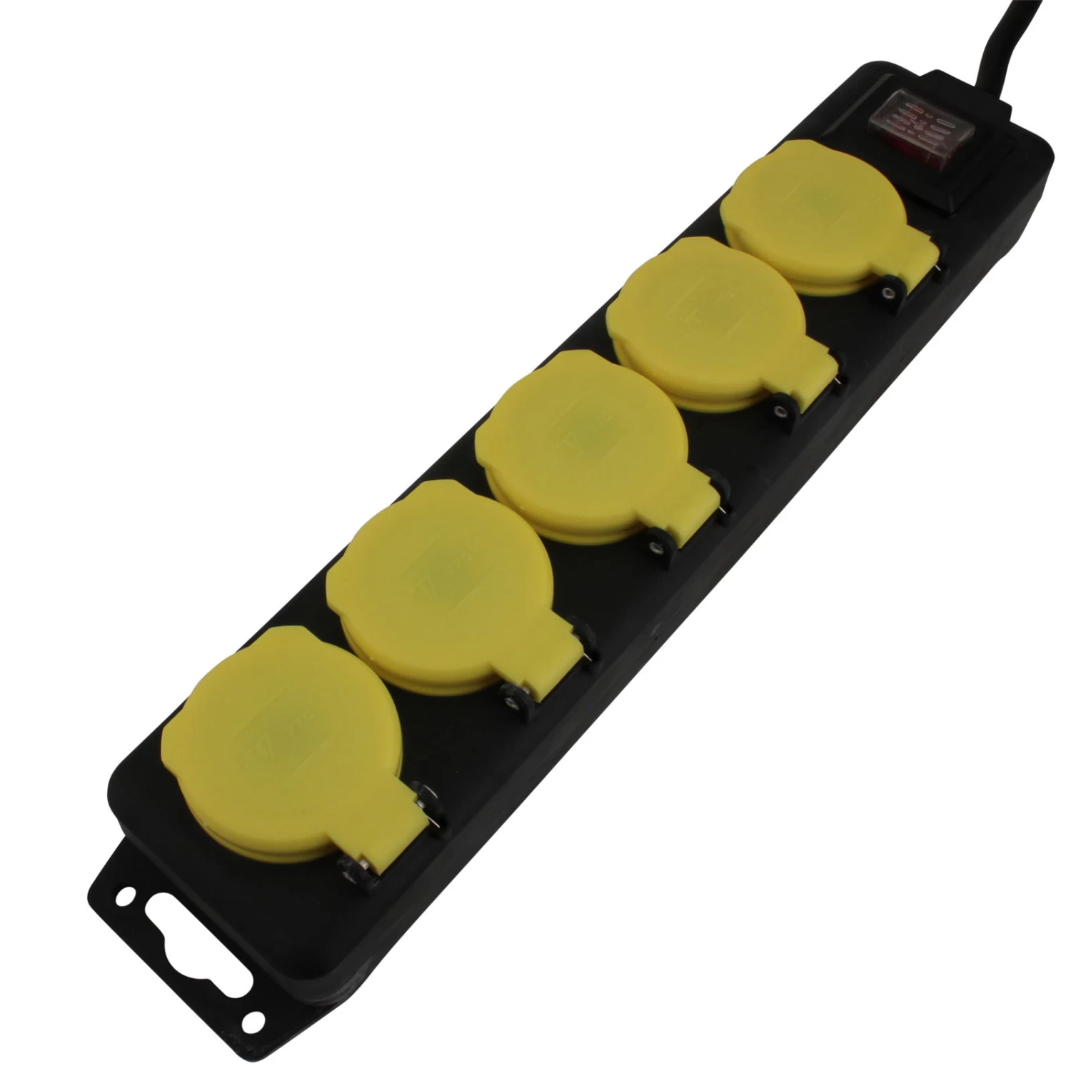 Mit der 5-fachen, für die Verwendung in feuchten Räumen geeignete Steckdosenleiste verlängern und erweitern Sie die Stromversorgung an feuchten Orten sicher und zuverlässig. Die schwarz-gelbe Feuchtraum-Steckdose ist spritzwassergeschützt und verfügt über eine integrierte Kindersicherung. Zudem ist das mit fünf Schutzkontakt-Steckdosen ausgestattete Gehäuse bereits für eine Festinstallation an der Wand (Schutzart: IP44) vorbereitet.