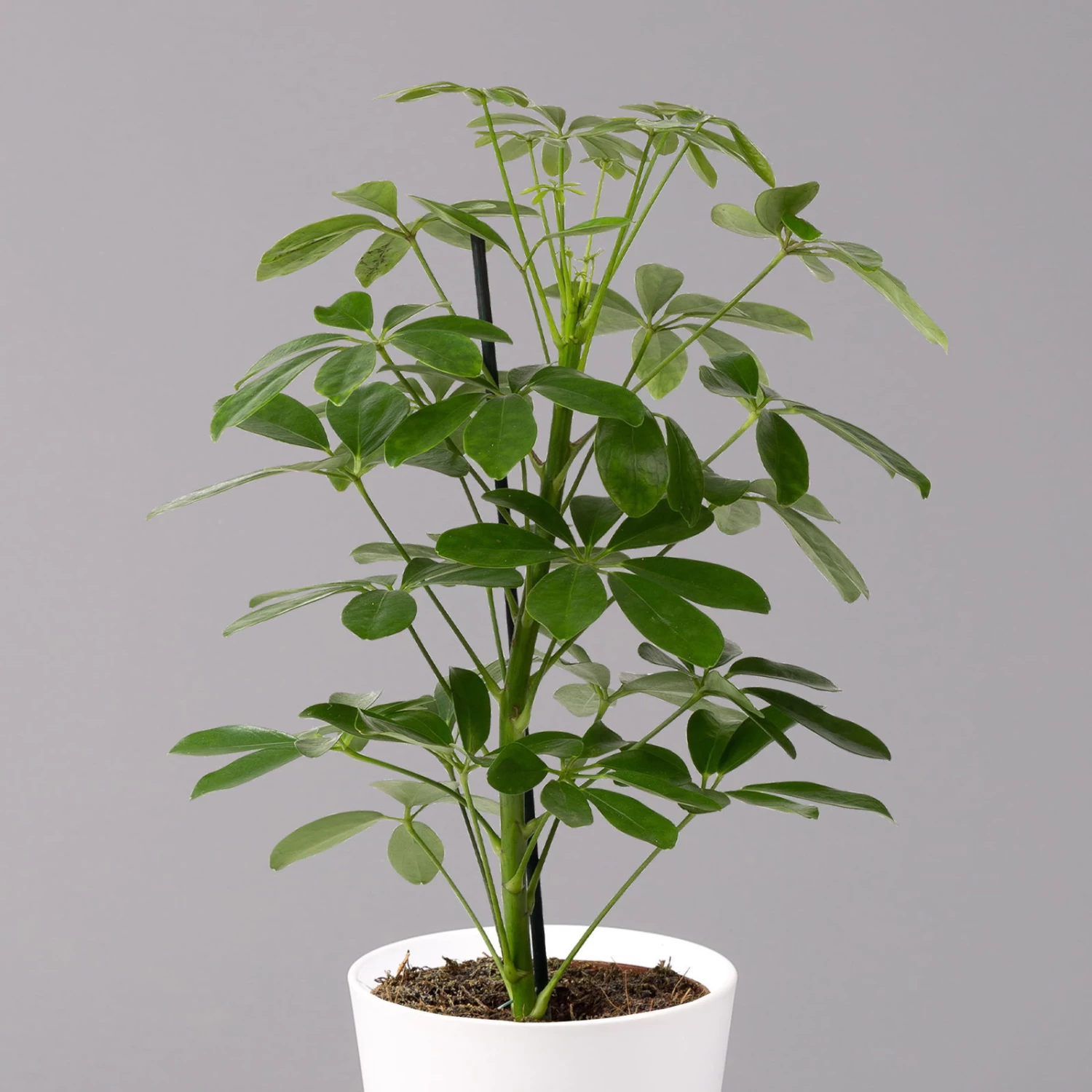 Die Strahlenaralie (Schefflera arboricola) zählt zu den beliebtesten Büropflanzen, da sie sehr robust und besonders schnellwüchsig ist. Die ursprünglich aus Taiwan stammende Tropenpflanze besticht mit den typisch strahlenförmig angeordneten Blättern, die kräftig grün und glänzend sind. Die Pflanze wächst schlank aufrecht und kann bis zu 2 Meter hoch werden. Ab einer gewissen Höhe bietet sich ein Moosstab als zusätzliche Fixierung an, welcher der Pflanze als Stütze dient.